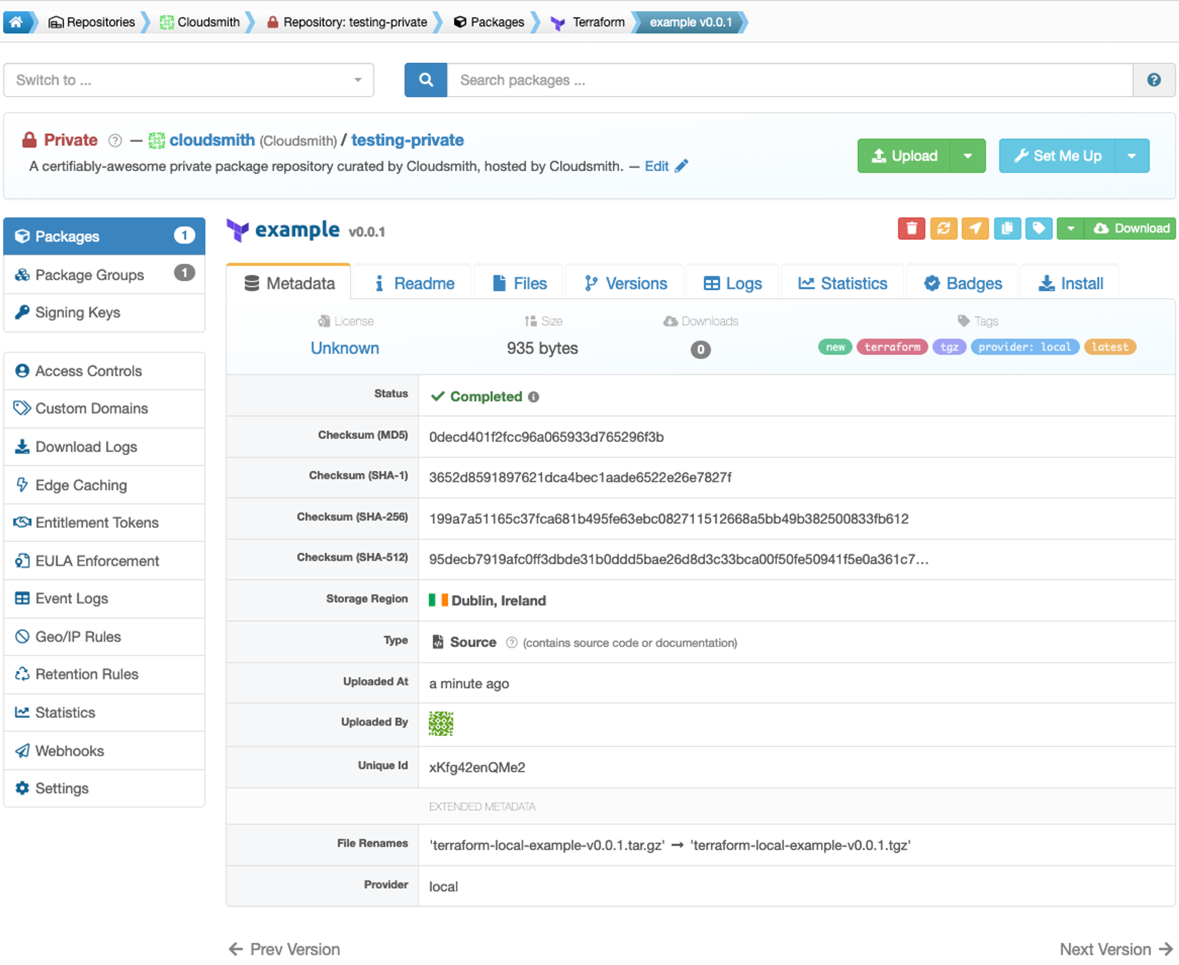 $ cloudsmith upload terraform your-namespace/your-repository terraform-local-example-v0.0.1.tar.gzOnce uploaded, you can view your module in Cloudsmith.