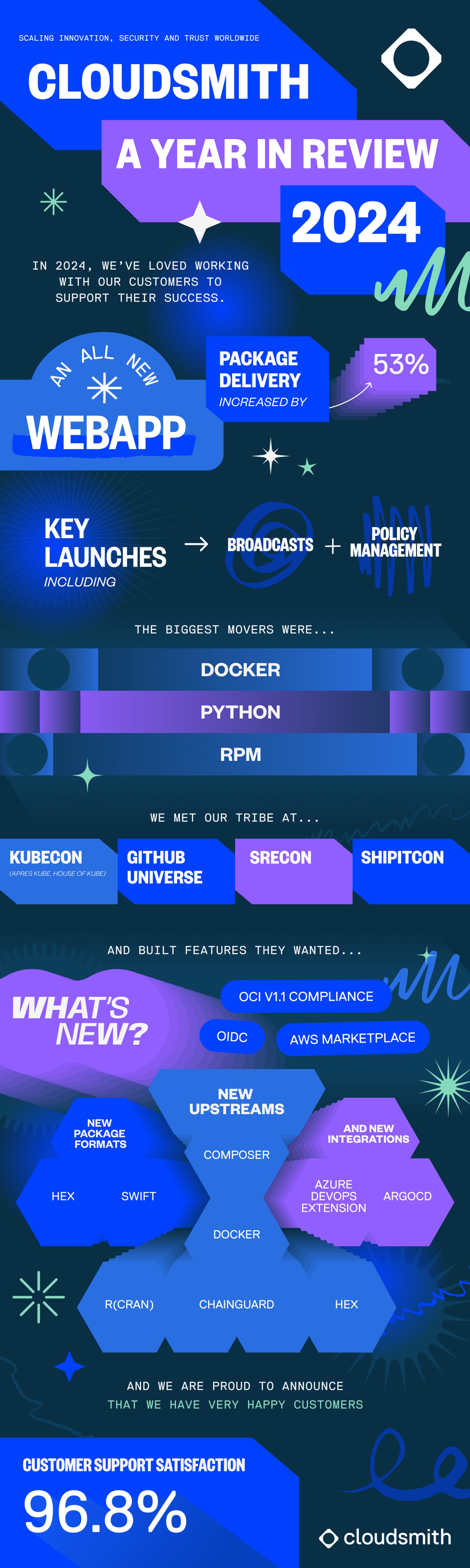 2024 was a year of incredible stories. At Cloudsmith, we had the privilege of being part of our customers' journeys as they reached significant milestones, driving growth, innovation, and strengthened trust across the globe. Our customers led the way, leveraging Cloudsmith’s capabilities to enhance their workflows, scale their operations, and secure their software supply chains. Let’s explore the amazing progress our community made together and the stories behind these achievements.