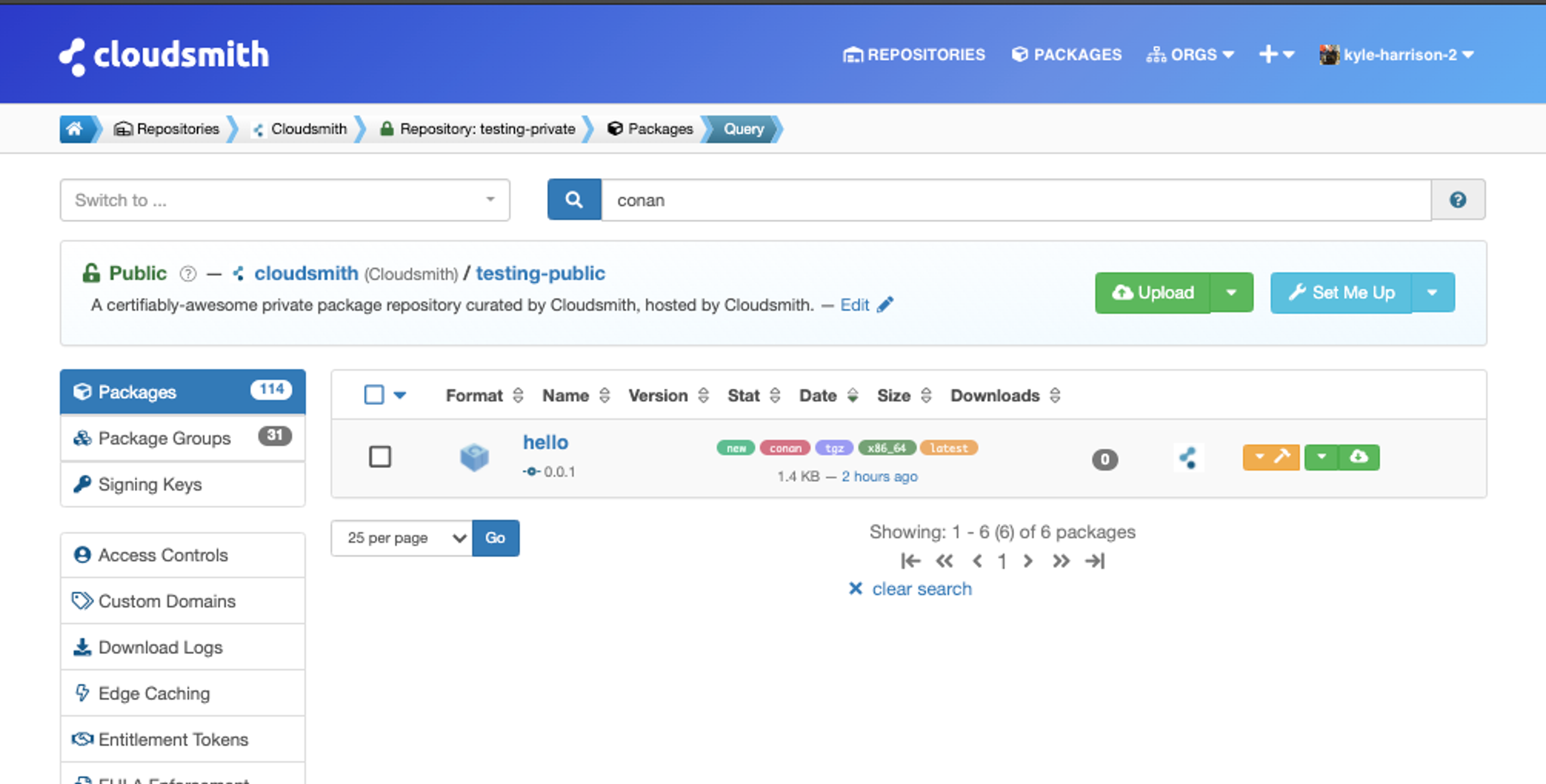 conan upload hello/0.0.1 --all -r cloudsmith-testing-publicOnce uploaded, you can view your package in Cloudsmith.