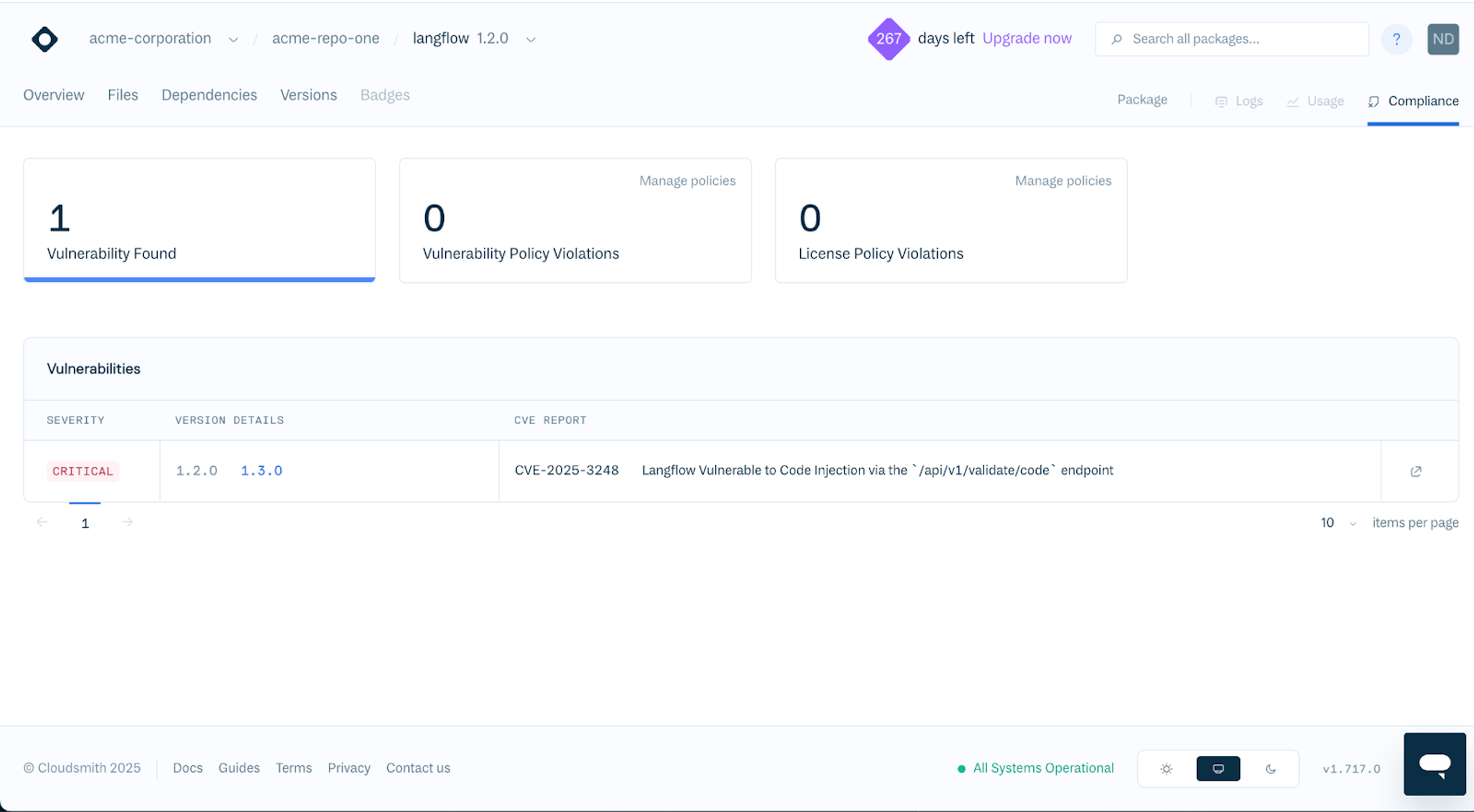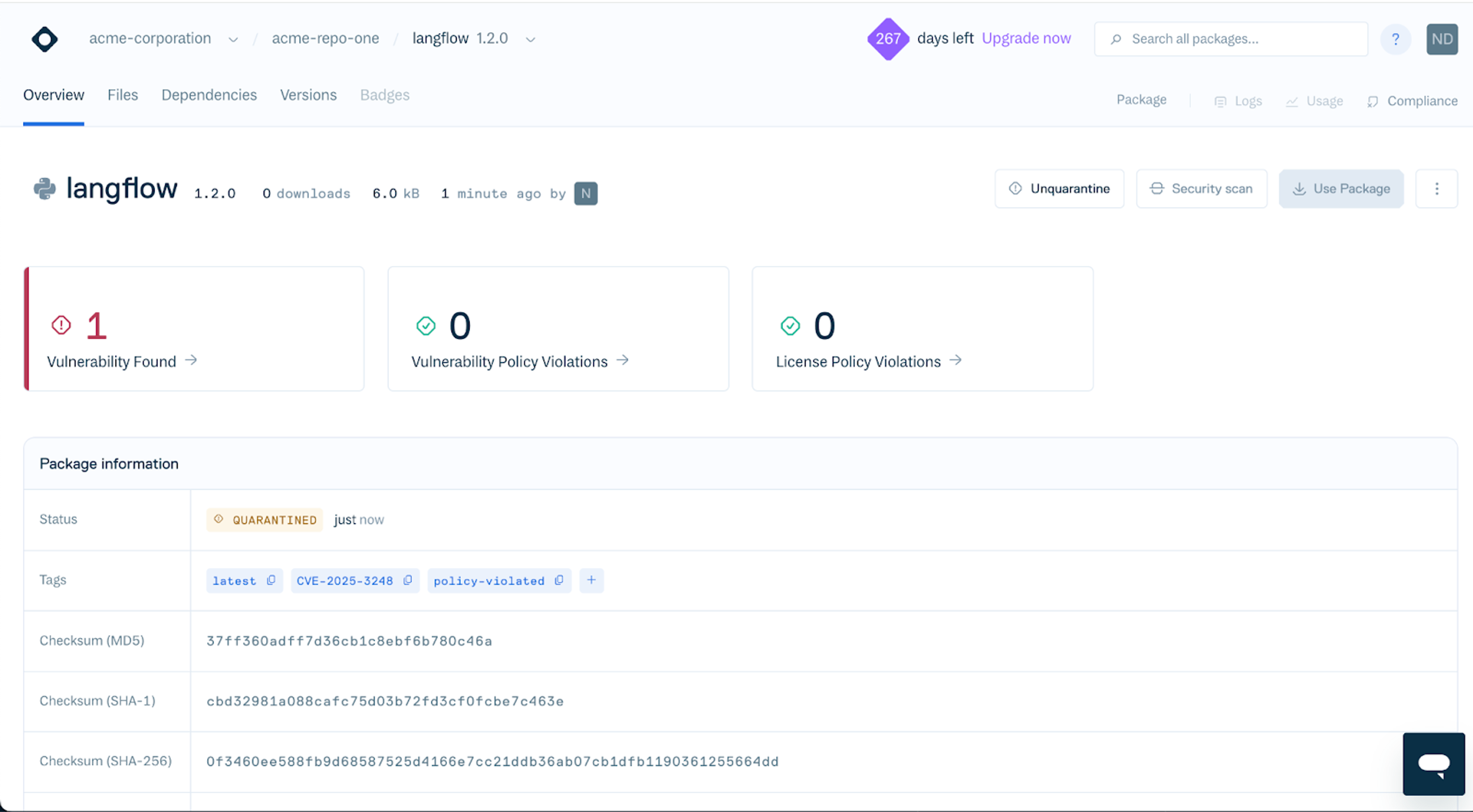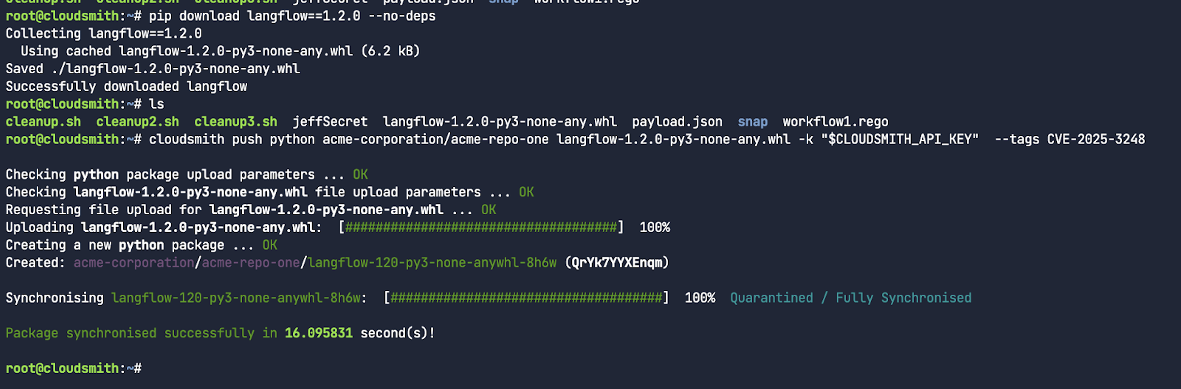 pip download langflow==1.2.0 --no-depsThe package was pushed to Cloudsmith with a custom tag referencing CVE-2025-3248. Note that it was synchronized and automatically quarantined based on the EPM policy we put in place.