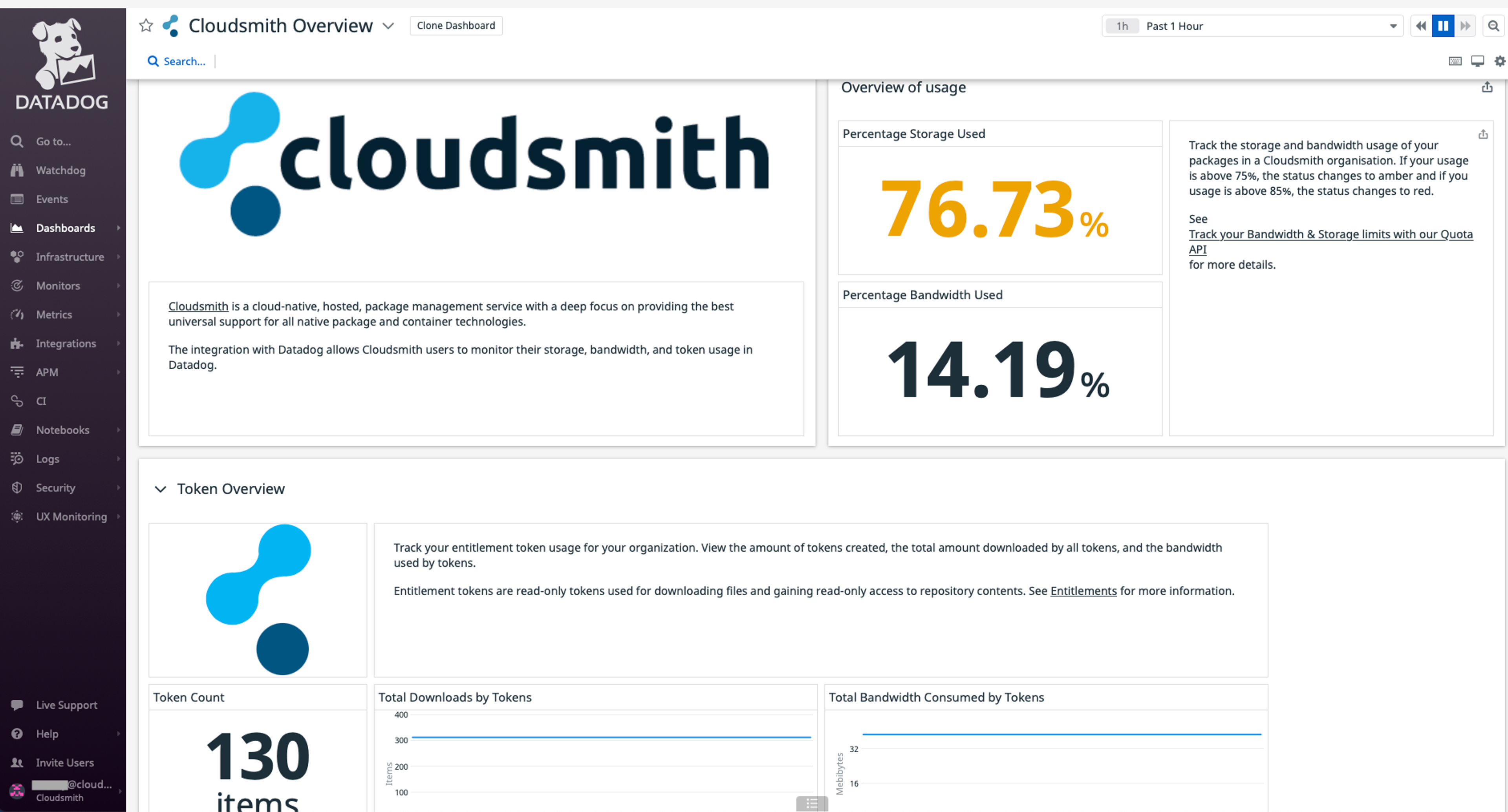 The Datadog Cloudsmith Integration is a simple and effective visualisation tool for monitoring your token, storage and bandwidth usage- never be surprised by an unexpected overage and give yourself time to change your settings before you reach your limit. If you identify a limit that is approaching a threshold, then you can quickly and easily adjust your limits at anytime within the Cloudsmith UI.