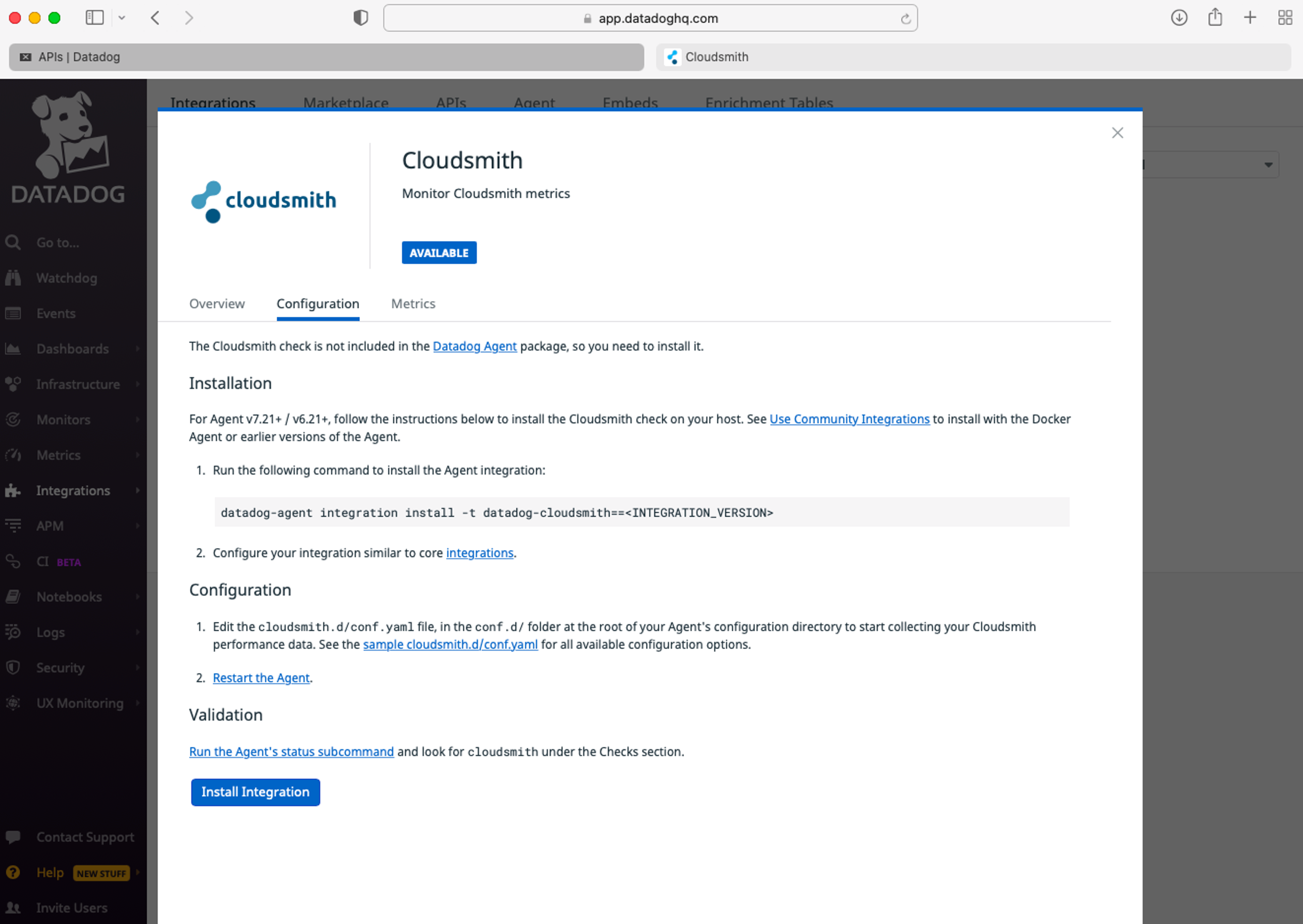Log into Datadog and from the side bar select Integrations->integrations and select the Cloudsmith integration.