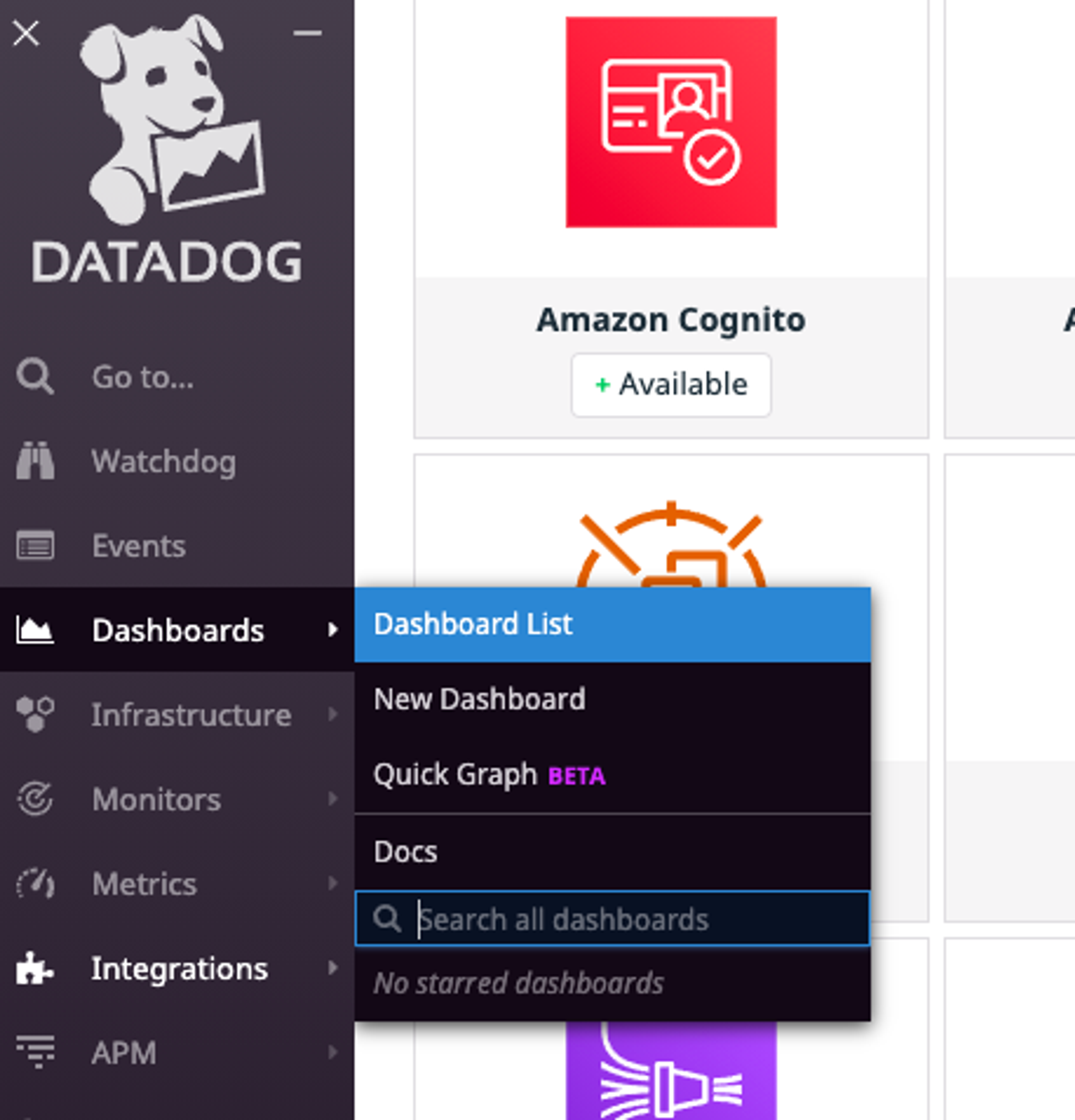 - From Datadog, select Dashboards->Dashboard list to view your dashboards.