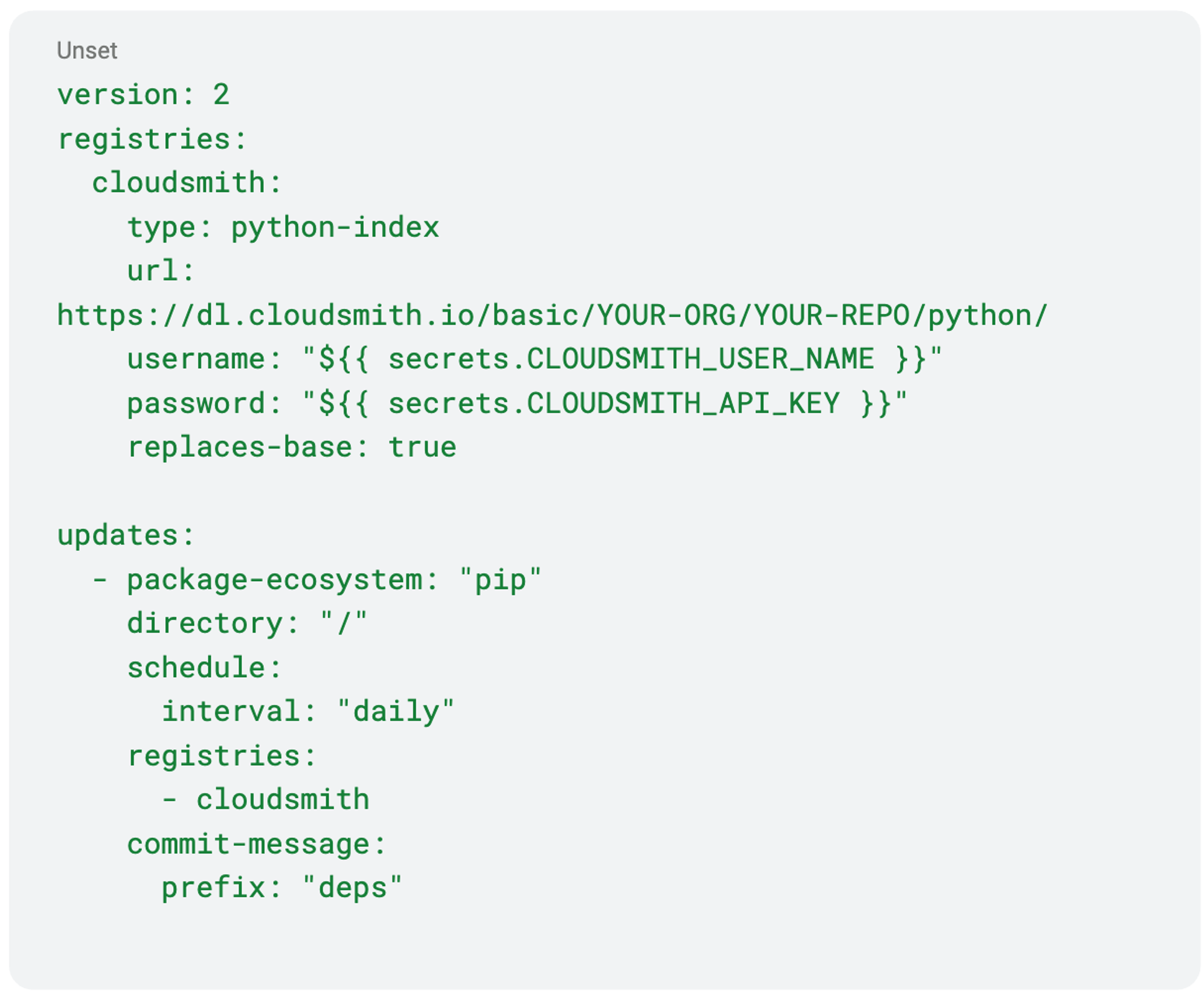 For more detailed instructions, please refer to our Cloudsmith Dependabot Integration Guide.