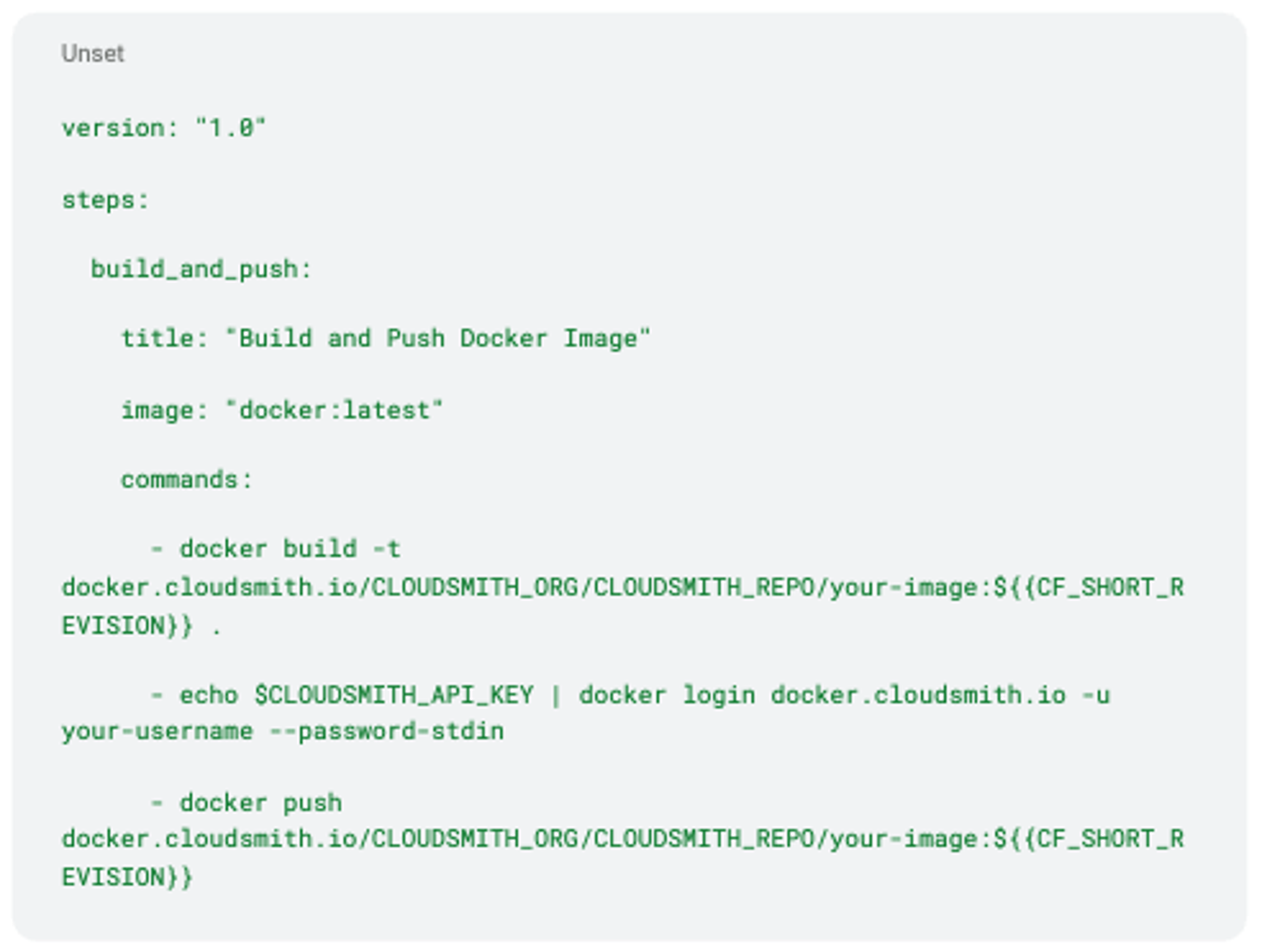 - Reference Docker Images: Use Docker images stored in Cloudsmith within your pipeline steps.