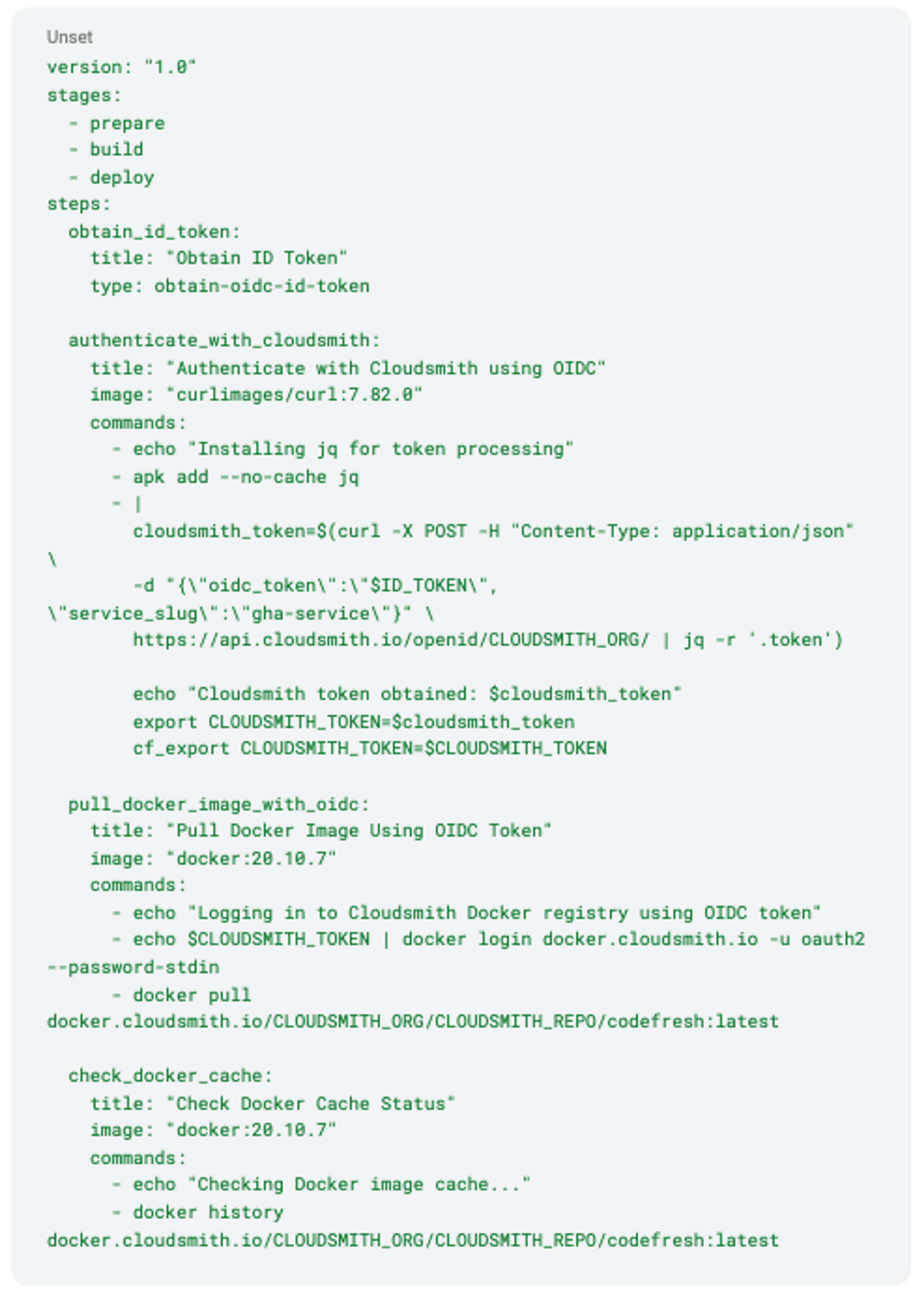 - Pull Docker Image Using OIDC Token: Logs into the Cloudsmith Docker registry using the obtained OIDC token and pulls the desired Docker image.