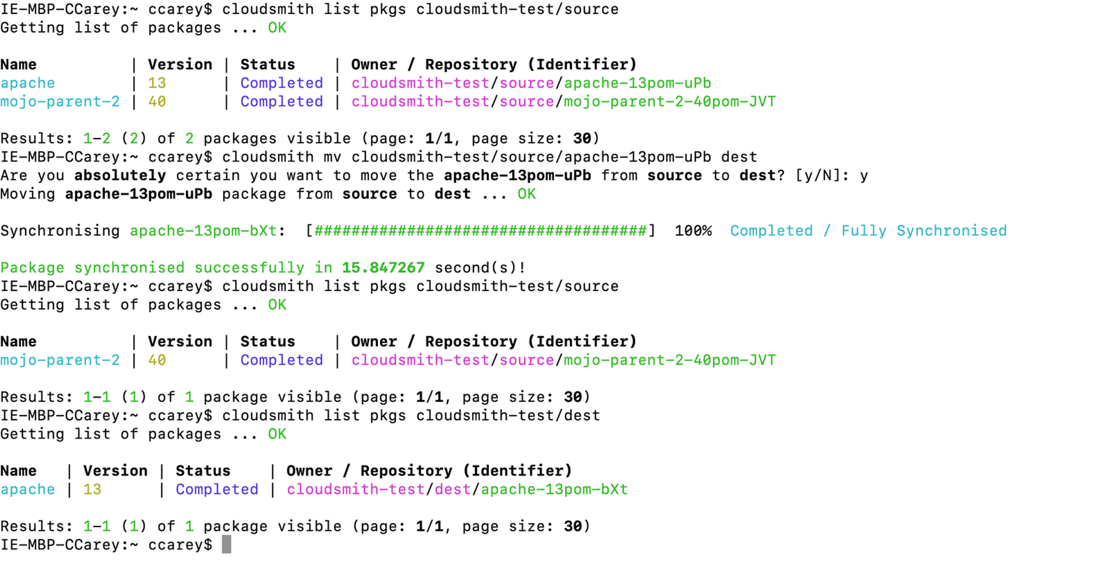 As you can see, the apache-13pom-bXt package was moved (or "promoted") from the source repository to the destination repository. Copying packages works the same, except it duplicates the package rather than moving it from the source to the destination.