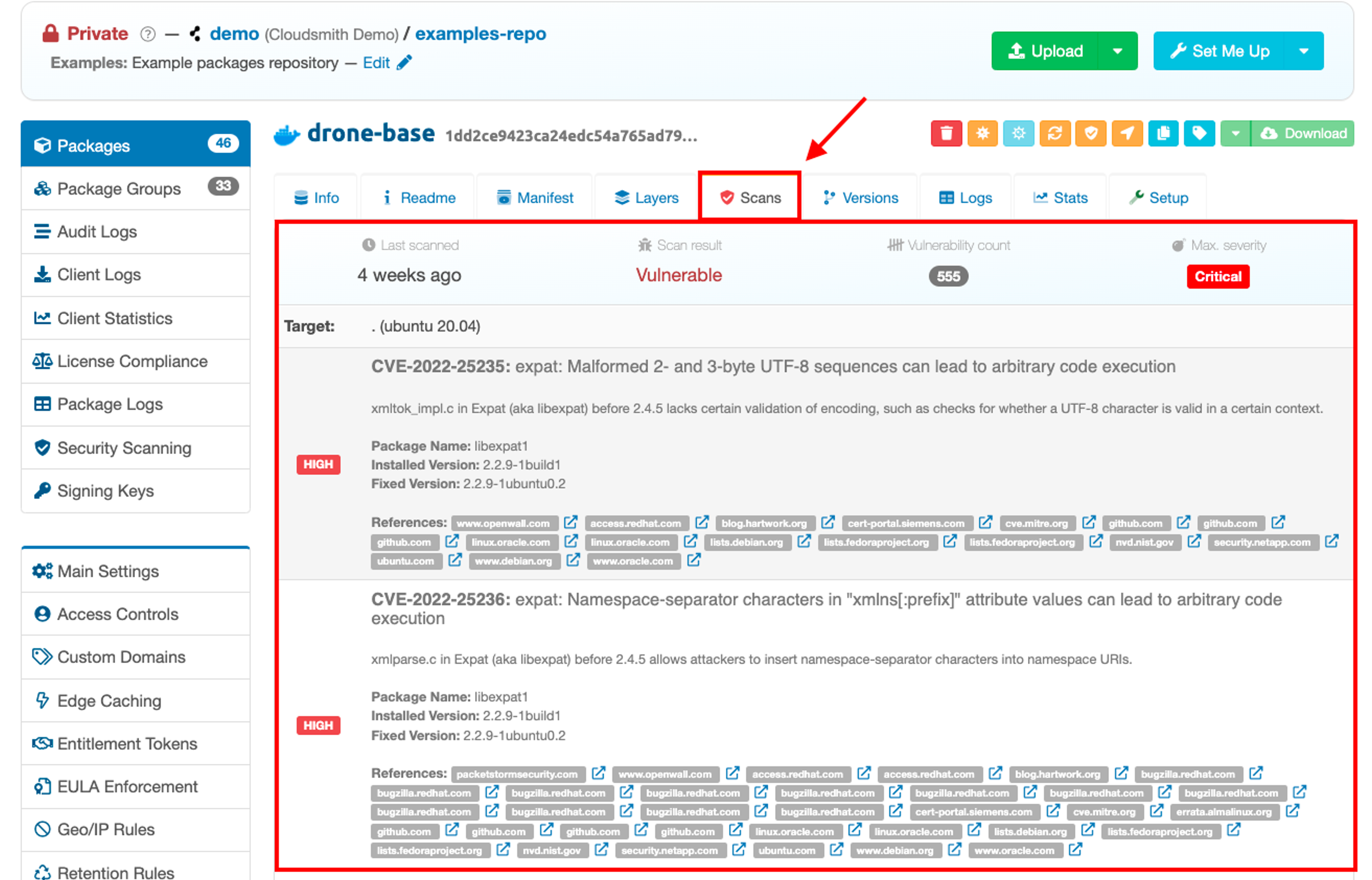 "vulnerability_scan_results_url":"https://api-prd.cloudsmith.io/v1/vulnerabilities/demo/examples-repo/IB6FYhIvaoAy/"This information can drive actions such as quarantining your Cloudsmith package based on the maximum severity reported.
