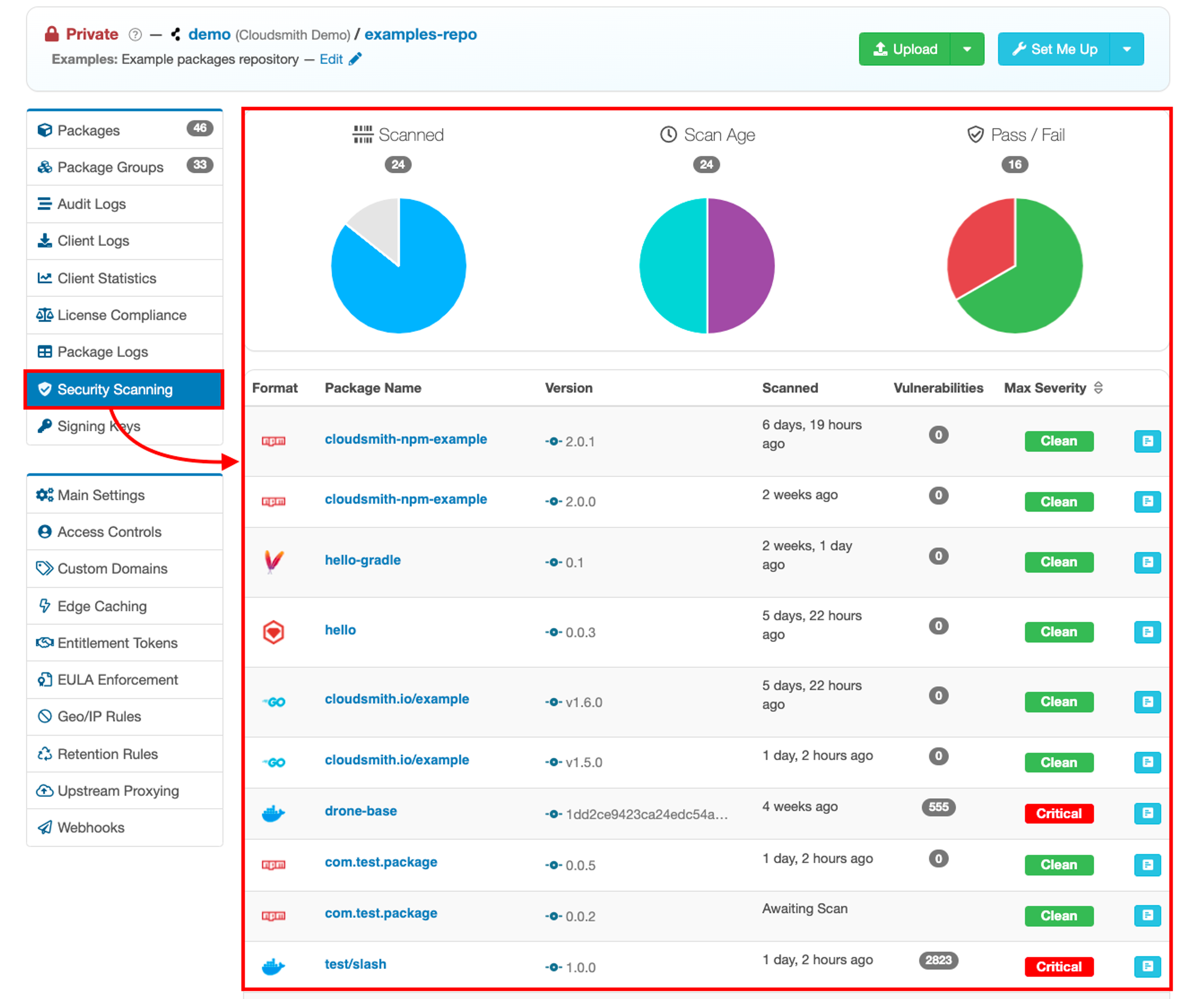 Cloudsmith's Security Scanning page shows a breakdown of the number of packages scanned/not scanned, the age of scans, the pass/fail count overall and the maximum severity of those found.