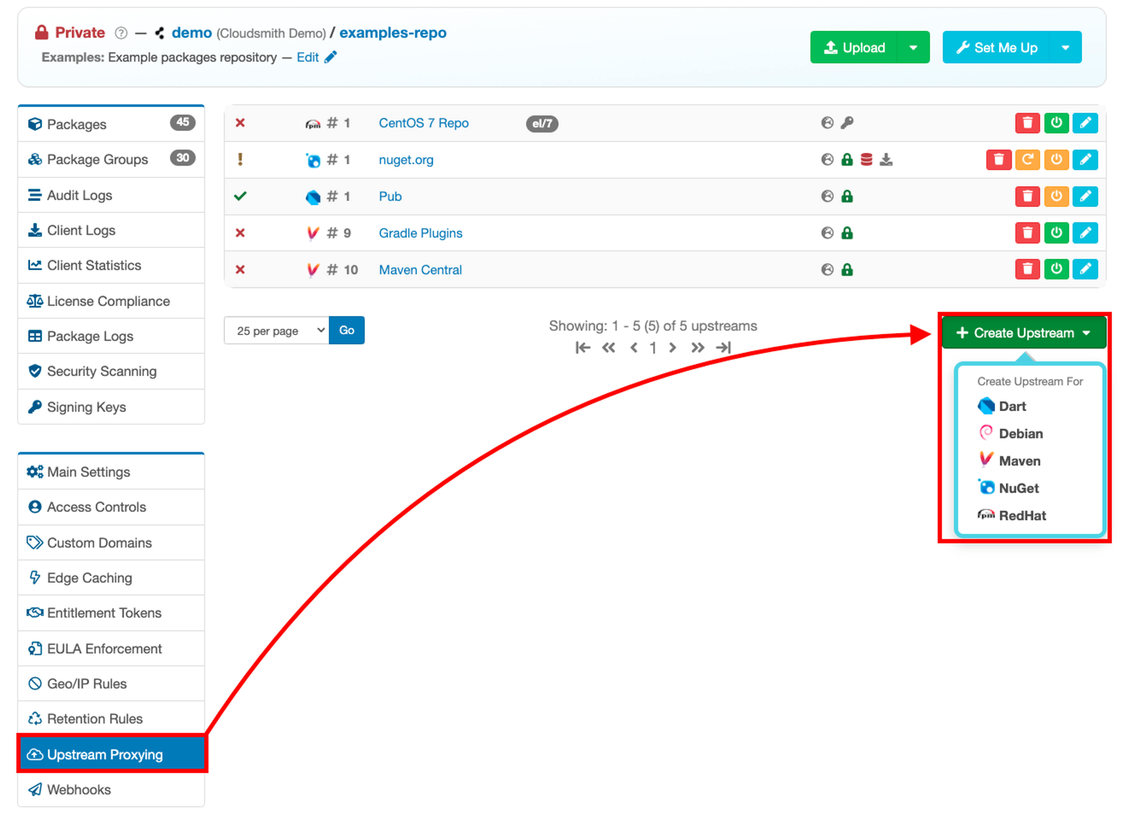 Cloudsmith's vulnerability scanner is most effective when combined with upstreams. Upstream proxying and caching allows you to upload and use the packages you own, while Cloudsmith fetches and caches your dependencies from public repositories e.g. Maven Central or NuGet.org.