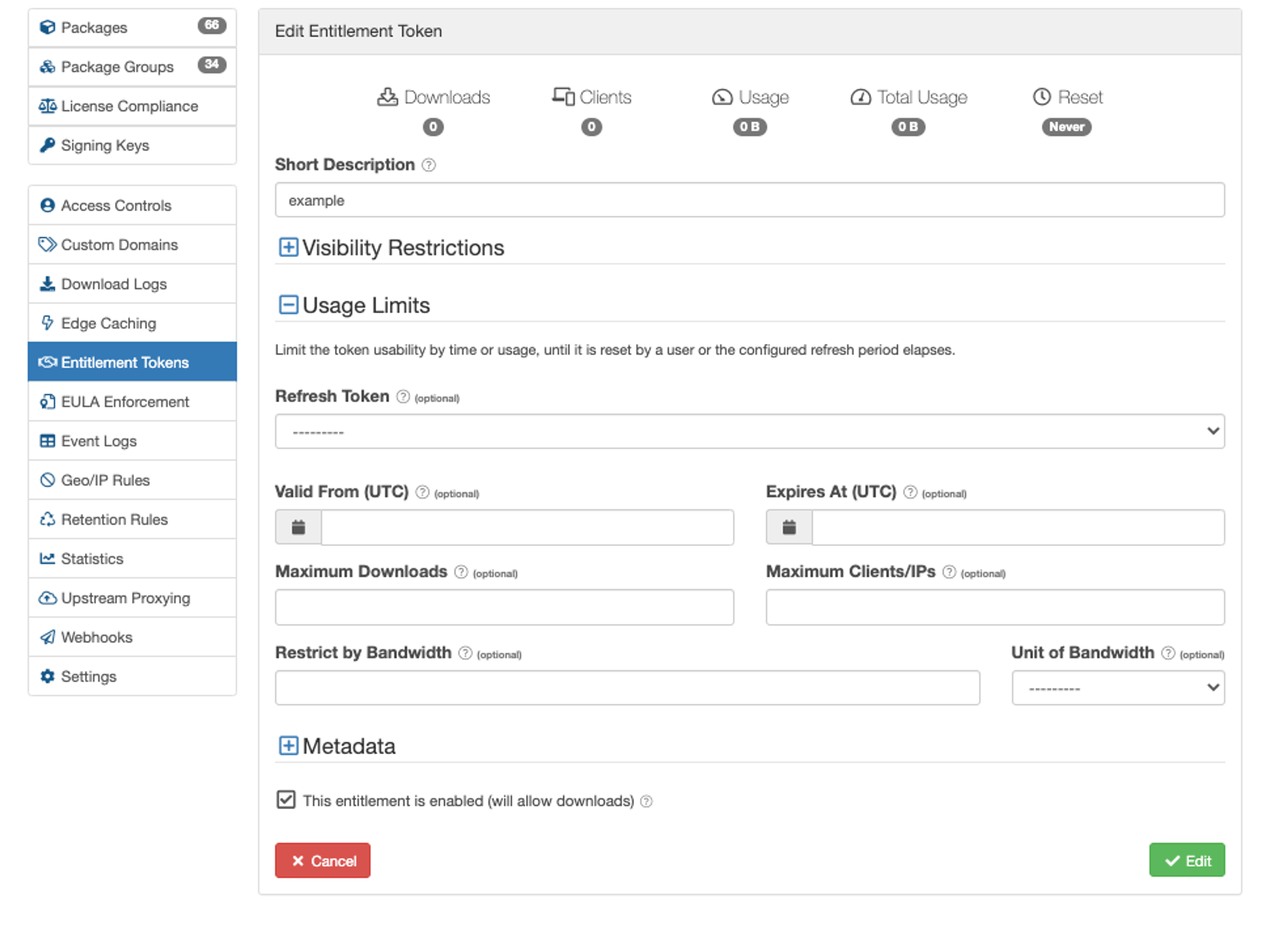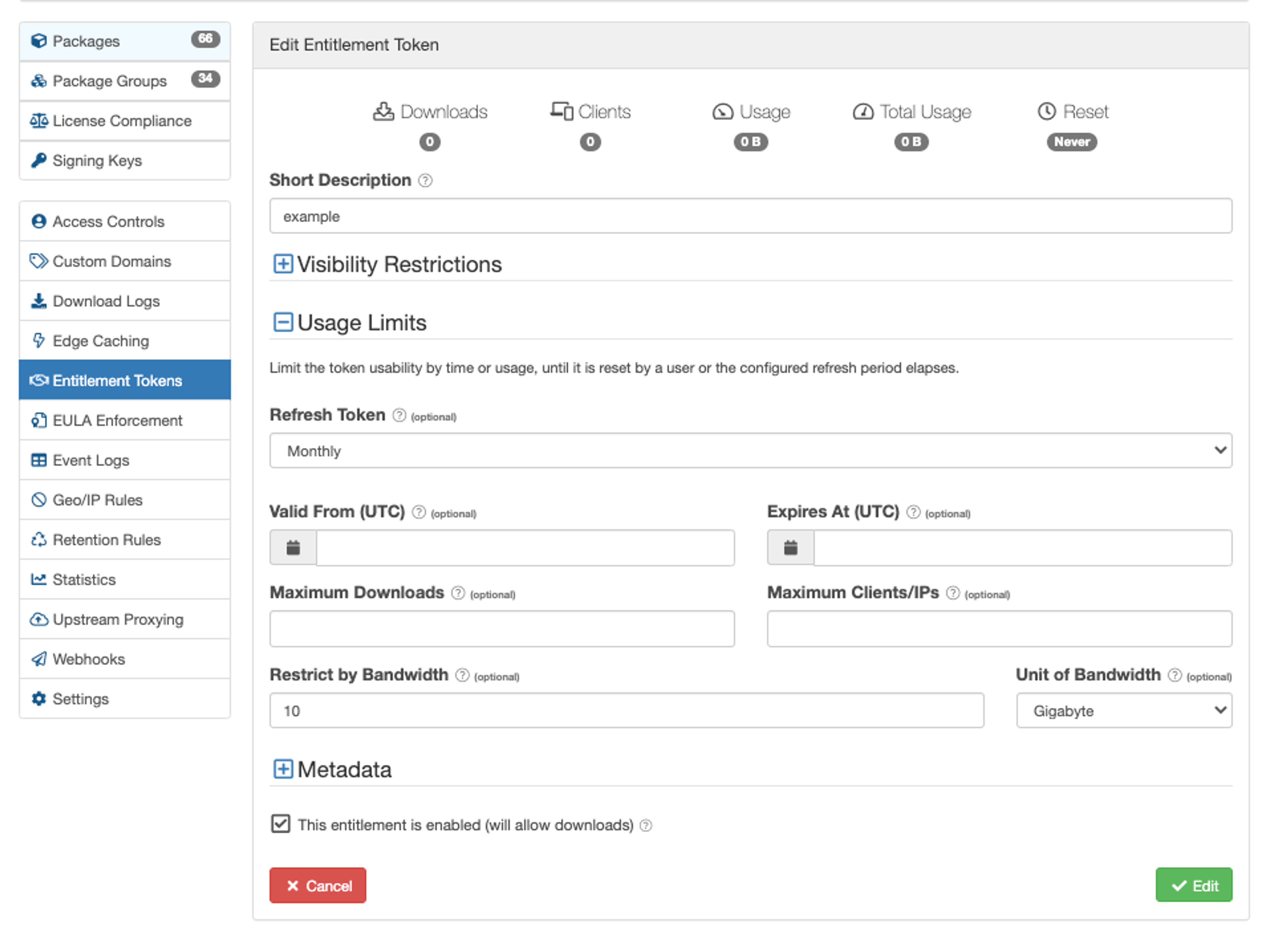 Within the Cloudsmith UI for Entitlement tokens, you can edit individual tokens to provide visibility restrictions, usage limits, or even provide additional metadata on the token for your own internal requirements.