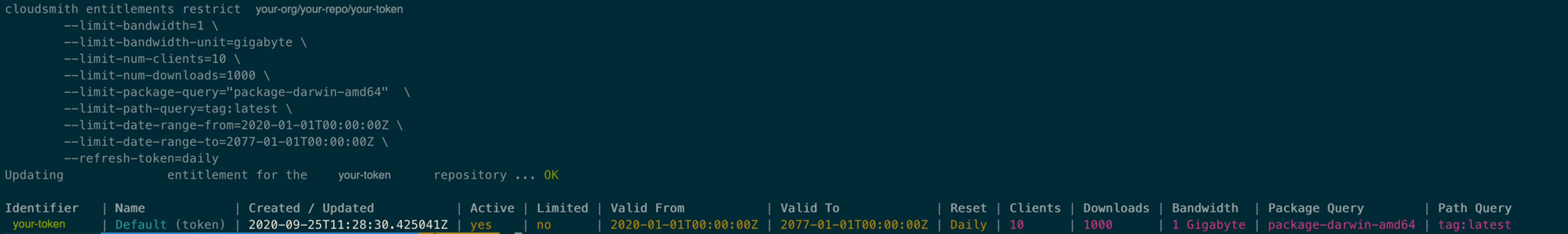 Finally, the easiest way to get started with making programmatic changes to entitlement tokens and applying restrictions is via the Cloudsmith CLI. Using the following command, you can all visibility restrictions and usage limits for an entitlement token.