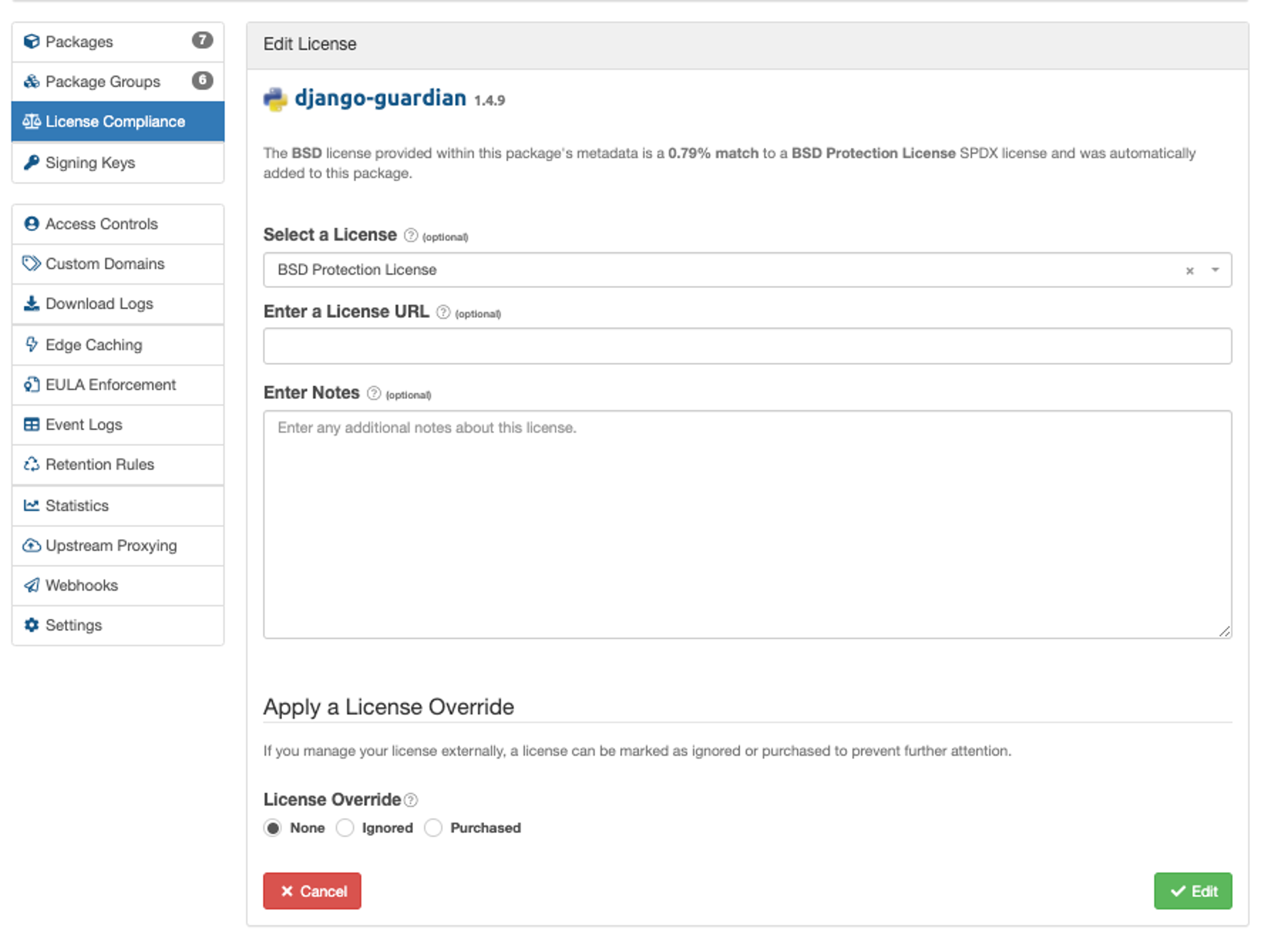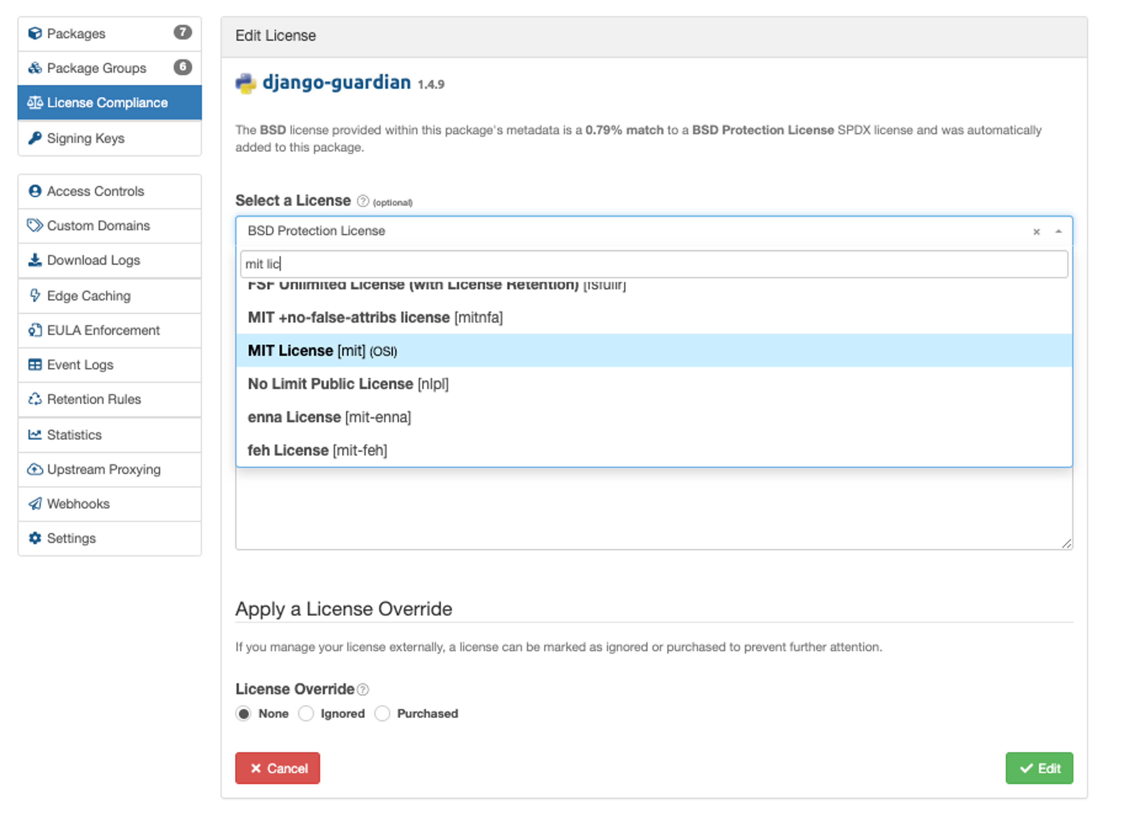 In this example, we want all our licenses to be uploaded with the MIT License; however, several packages are missing licenses, and one package has uploaded with the wrong license. Let's open the edit view for the django-guardian package and update it to use a MIT License.