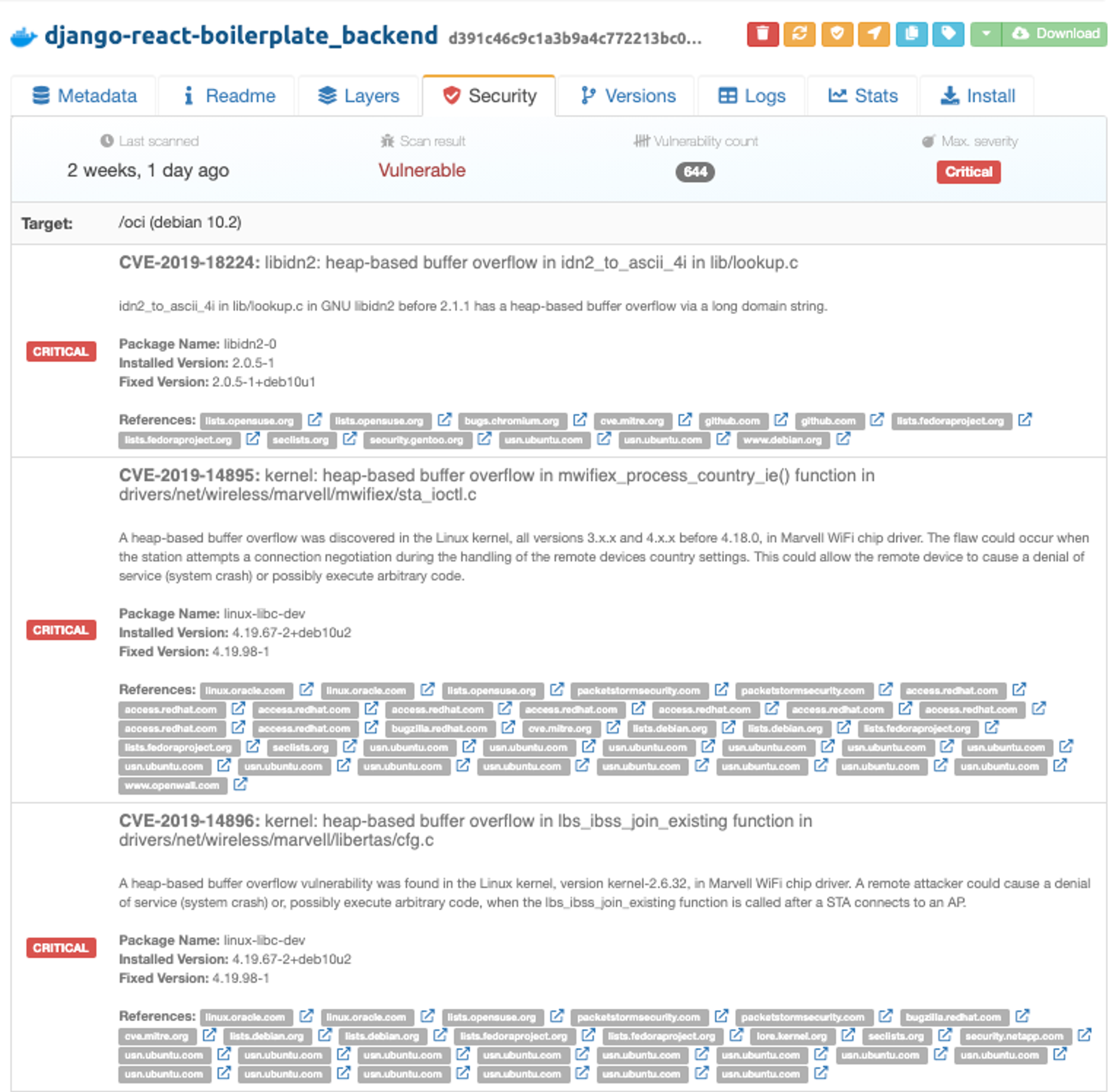 Finally, we offer programatic access for scan results and historic scan results via our Vulnerability API. You can discover find vulnerabilities within your namespace, repository, and package, and drill down deeper into the exact CVE's by looking up the sequential scan_id.