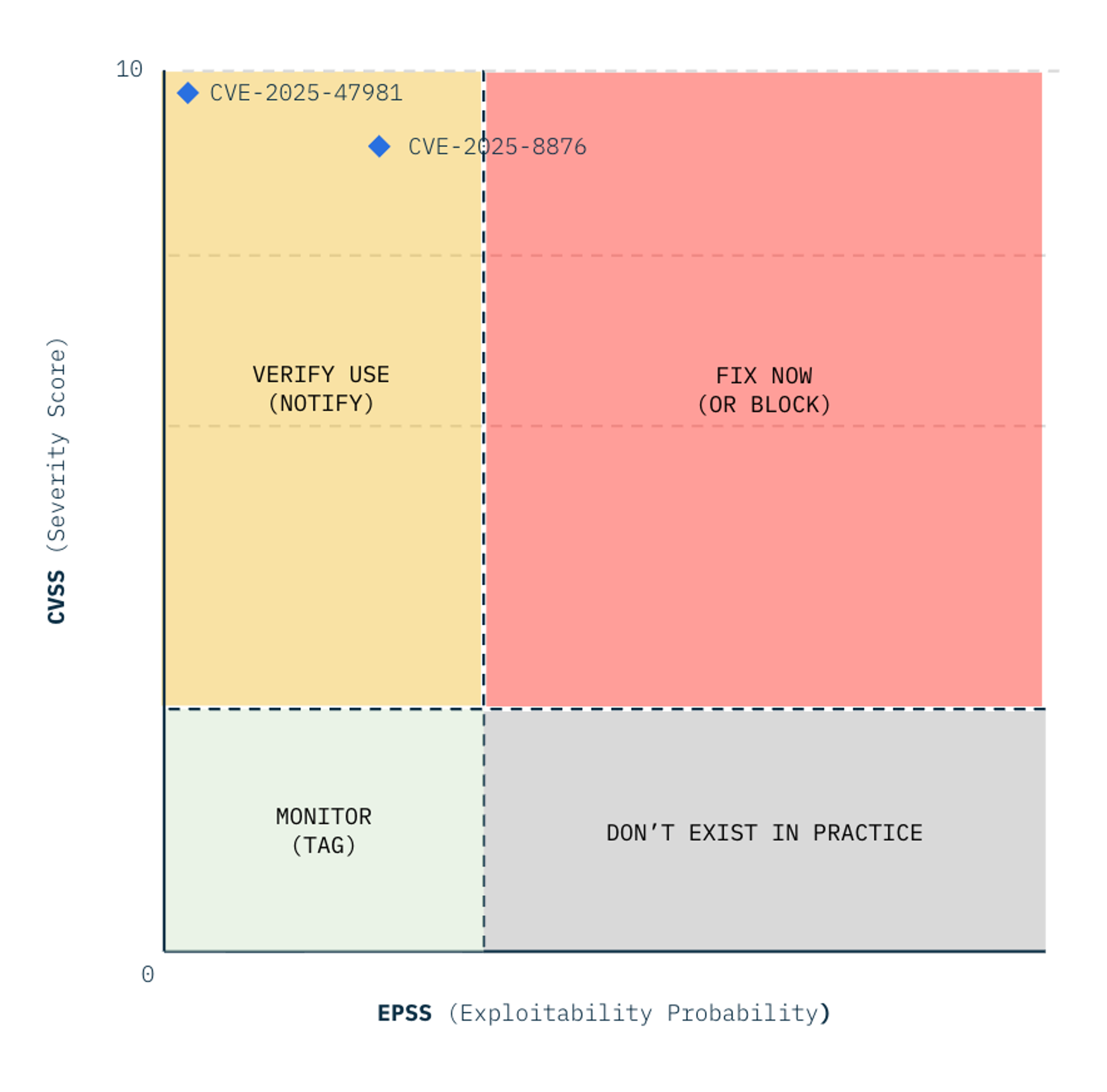 For example, a “High” CVE with low CVSS and EPSS may not need urgent action. - Always assess whether the vulnerability is actually exploitable in your environment. Do this before deciding to block or patch a vulnerable software package.