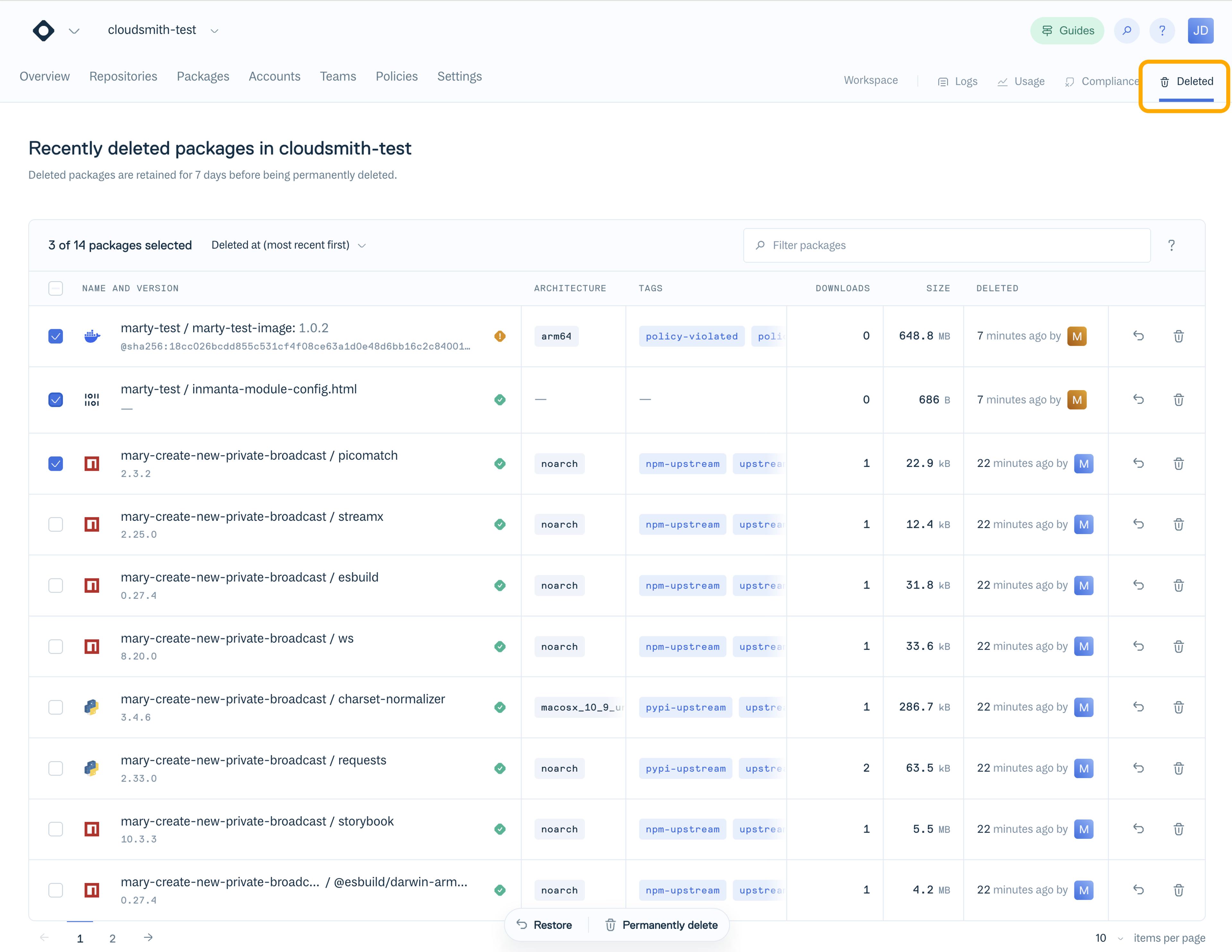 The recently deleted packages view is available now in the Cloudsmith web app. Head to your workspace or repository to get started, or see the recently deleted packages documentation for more details.